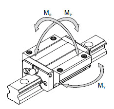 在直線導(dǎo)軌上作用力矩時,從直線導(dǎo)軌內(nèi)的滾動體應(yīng)力分布來看,兩端的滾動體產(chǎn)生最大的應(yīng)力。所謂的容許靜力矩(M0),是指在產(chǎn)生最大應(yīng)力的接觸面處,使?jié)L動體與滾動面間的永久變形量之總和達(dá)到鋼珠直徑的0.0001倍時,方向和大小一定的靜止力矩。所以容許靜力矩即為靜的作用力矩的限度。在直線導(dǎo)軌中是以MP、MY、MR這3個方向的力矩來定義的。