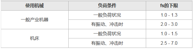 當(dāng)直線導(dǎo)軌使用在有振動、沖擊或激烈的啟動停止情形,由于慣性力或力矩等外力的作用,會有大的負(fù)荷產(chǎn)生,對于這樣的負(fù)荷狀況,有必要考慮靜安全系數(shù)。靜安全系數(shù)(fs) 是按直線導(dǎo)軌的基本額定靜負(fù)荷(C0),為作用在直線導(dǎo)軌上的負(fù)荷的多少倍來表示,如下式所示。各種應(yīng)用狀況的靜安全系數(shù)之基準(zhǔn)值,如下表所示。