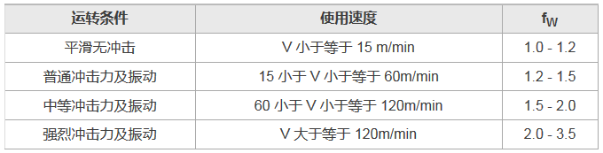 雖然直線導(dǎo)軌所承受的負(fù)荷可藉由計算求得,但實際使用時大都伴隨著振動或沖擊,負(fù)荷多會大于計算值。因此在考慮不同的運轉(zhuǎn)條件與使用速度下,建議依經(jīng)驗所得到的負(fù)荷系數(shù)除以基本額定動負(fù)荷C,如下表所示。