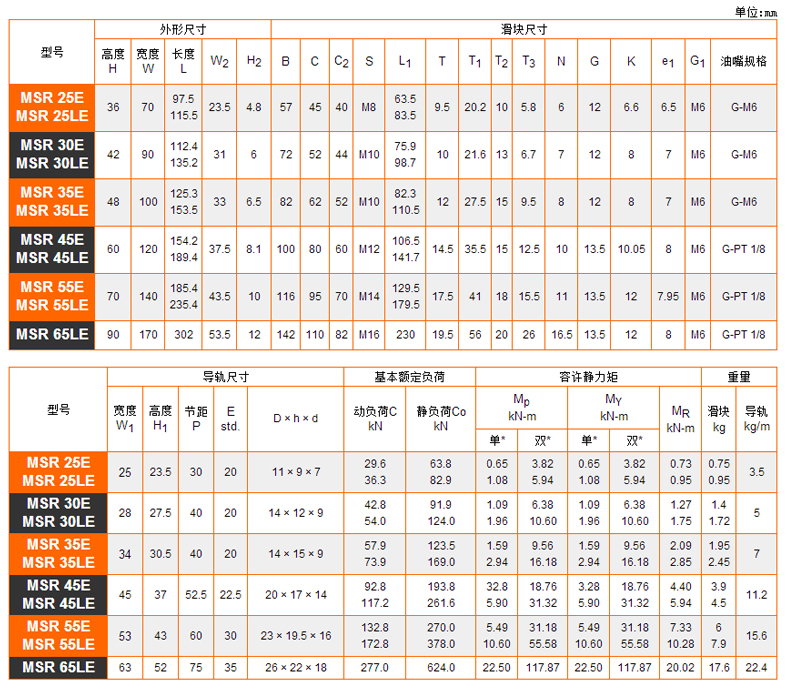 注*: 單:單滑塊 / 雙:雙滑塊緊密接觸